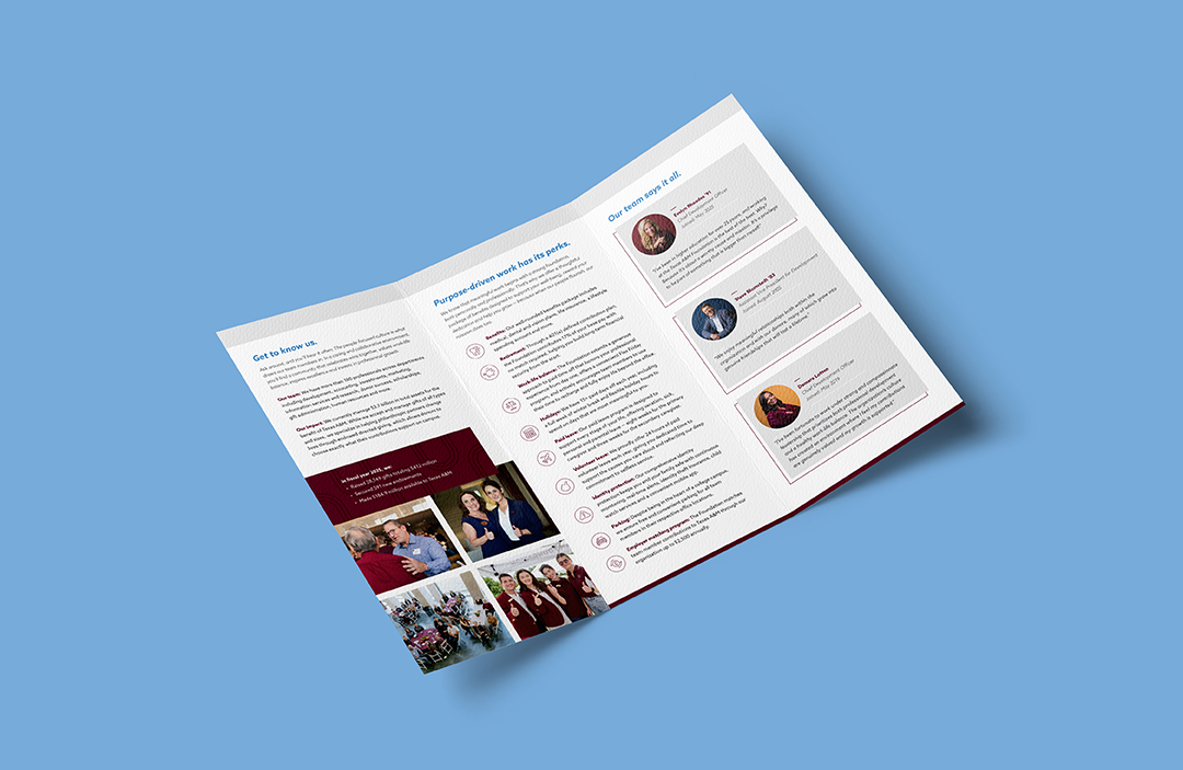 During my tenure at the Texas A&M Foundation, I managed the creation, approval and production of more than 200 brochures (including a rebrand overhaul in my first six-months), designing many by myself, but also with the assistance of some helpful student workers. Below are some of my favorites: