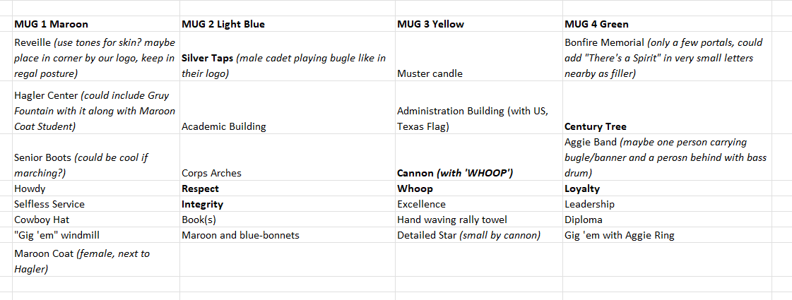 With so many options of different Aggie elements to include, our illustrator, Brave the Woods, had an overflowing sandbox to dig into. After receiving his initial rough sketches, it was clear I needed to provide additional guidance on which items made the most sense when grouped together to an Aggie audience. But having his rough sketches helped these thoughts click into place with a visual reference and outlined some grey areas I needed to color in for him (like the usage of natural skin tones outside of our brand color palette). From here, I was able to clearly define which items should go on each mug and how these groupings could guide our color palette selection for each mug.