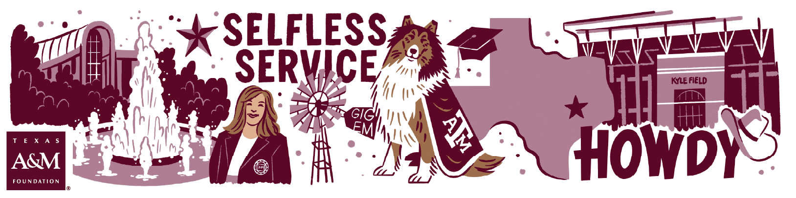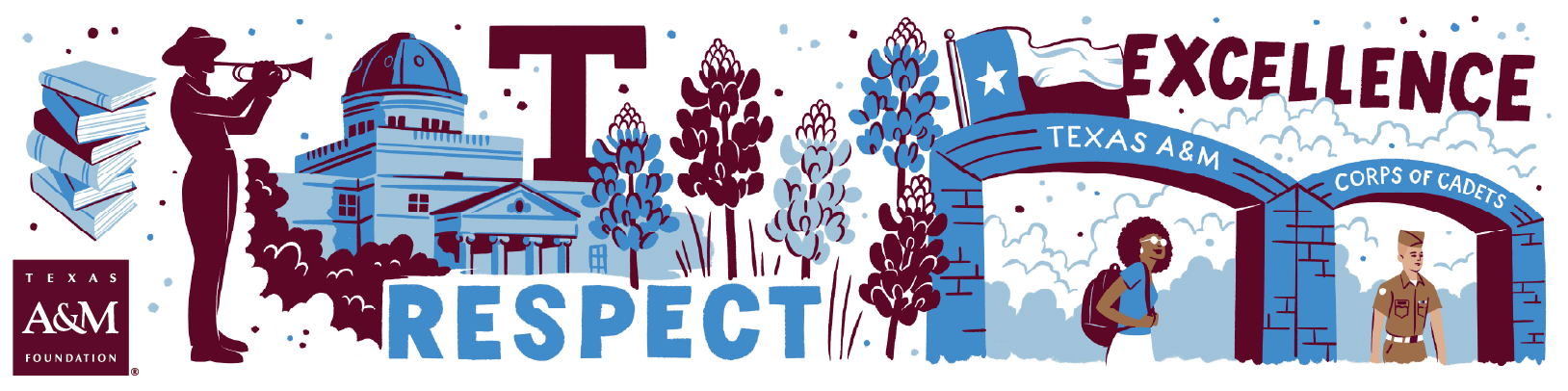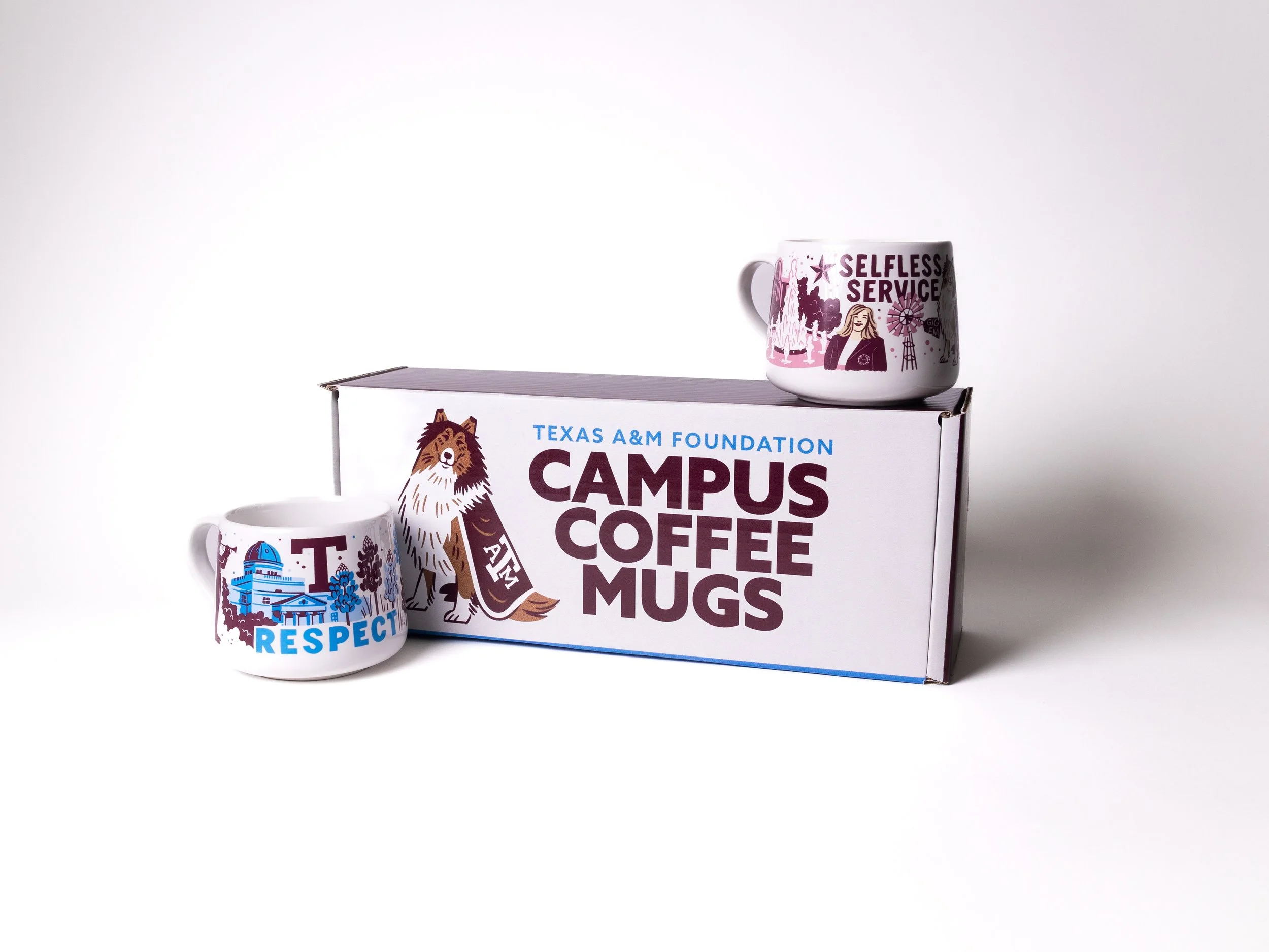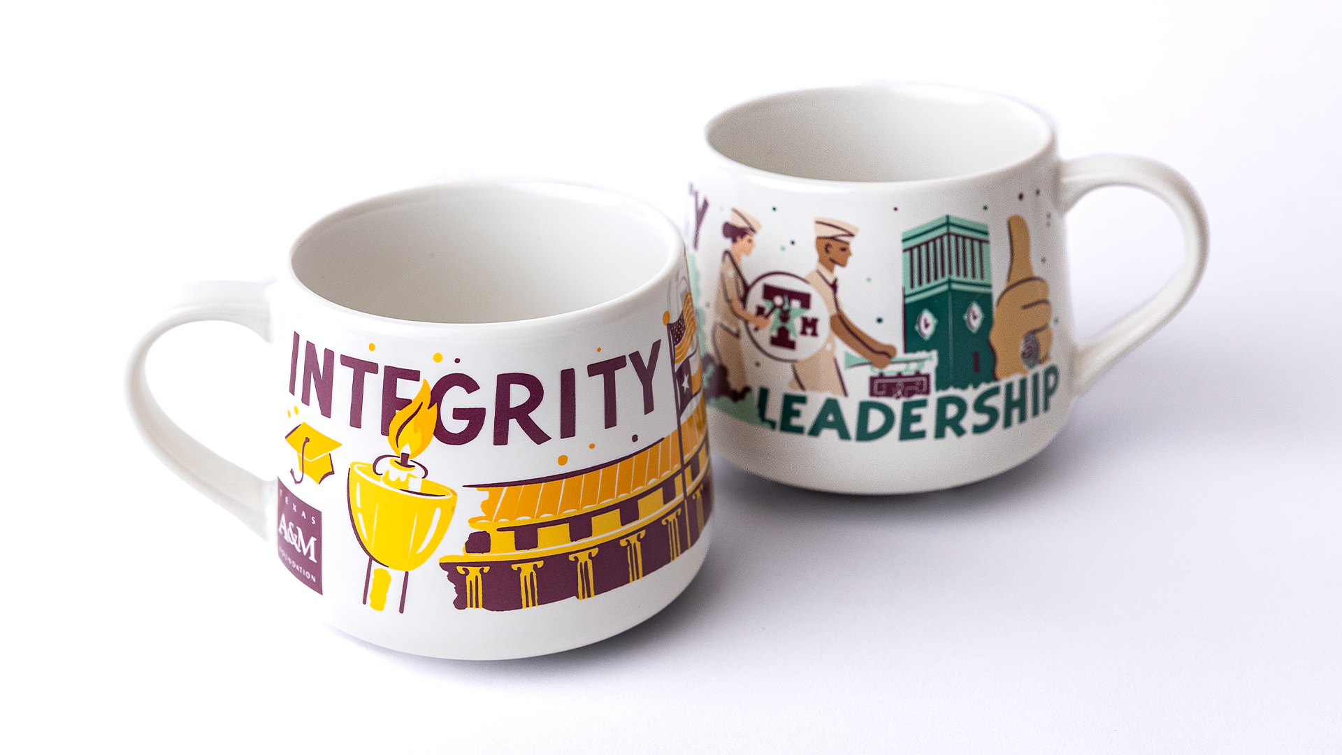 As Aggies, we were guided by Texas A&M’s core values to help make this mug series special. We wanted to include each of the six values written out on the different mugs but also needed to creatively fill the space with other iconic Aggie imagery. Since the Foundation supports every unit across campus, we had to be careful not to show a bias toward one unit over another but decided we should include a few specific Corps of Cadets icons given their involvement in many campus activities and the university’s military background. Lastly, we knew we wanted a touch of maroon on each mug but also wanted to find a way to give each mug a unique feeling and color palette.