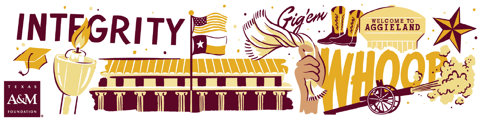 In addition to outlining the basic design specifications, such as color palette, logo usage, timeline, and background information, I compiled a curated list and matching reference images in the following categories for guidance on our Aggie imagery: Aggie traditions; campus buildings and landmarks; Aggie values and sayings; Corps of Cadet imagery; and miscellaneous iconography tied to Texas and higher education in general.