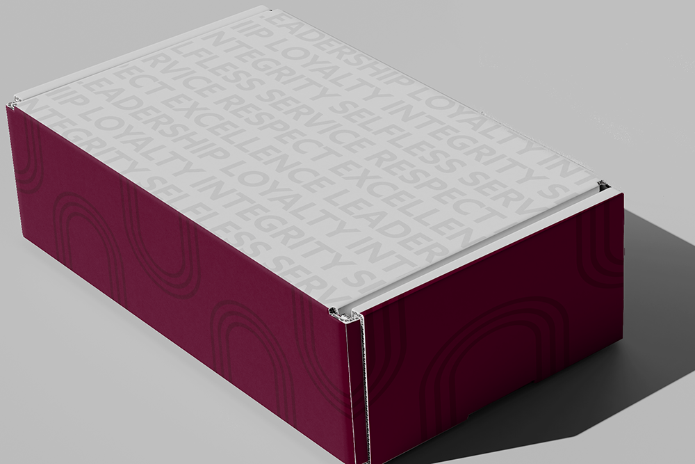 background outline type reading “Brighter Future” (part of our mission statement) on the inside top lid